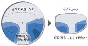 マイチューンは「玉型形状データ」に基づき、一人ひとりのフレーム形状、アイポイント(EP)位置を分析し、レンズ設計を累進面から最適化します。